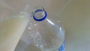 なんとか割りばしで少しずつ移したが.それでもこれだけこぼれてしまった.次回はこの過程は省いてコーラのペットボトルのの中でそのまま発酵させる事にしよう.
